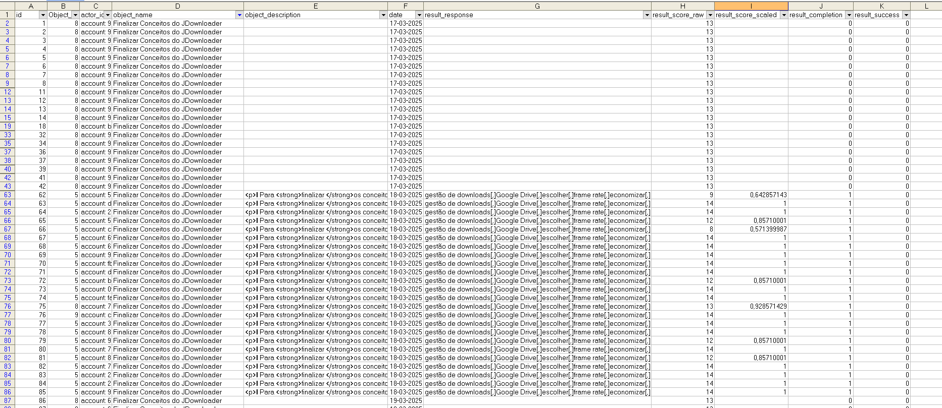 De notar que as linhas em branco significam que o aluno esteve na folha do recurso, mas apenas quando tem object_description, result_responde, result_score_raw, result_score_scaled e result_completion significa que houve resposta ao recurso e que essa resposta ficou registada com a respetiva escala.